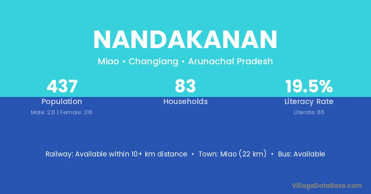 Miao (22 km) is the nearest town to Nandakanan village for major economic activities and is located approximately 22 km away.