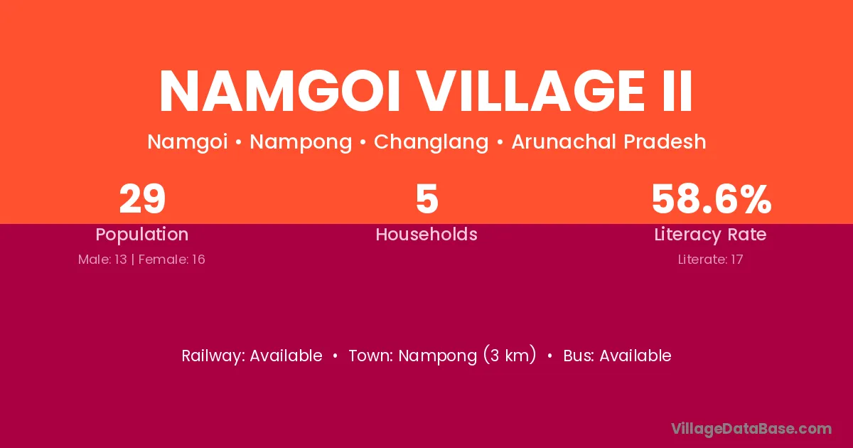 Namgoi Village Ii village has a total population of 29 people, of which 13 are males and 16 are females.