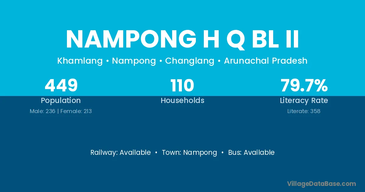 The literacy rate of Nampong H Q Bl Ii village is 79.73%. Male literacy stands at 83.47% and female literacy at 75.59%.