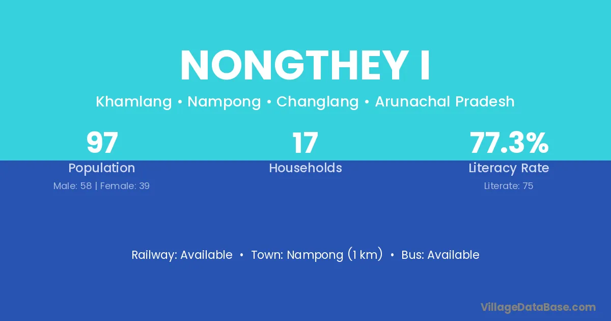 Nampong (1 km) is the nearest town to Nongthey I village for major economic activities and is located approximately 1 km away.