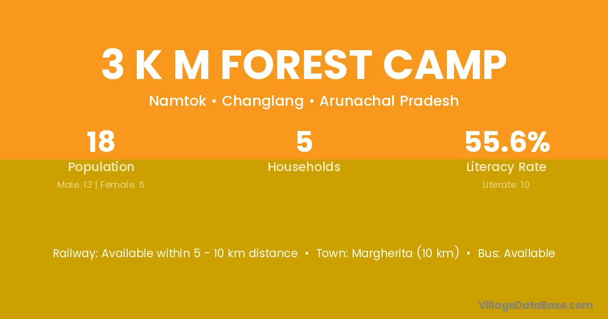 3 K M Forest Camp village has a total population of 18 people, of which 13 are males and 5 are females.