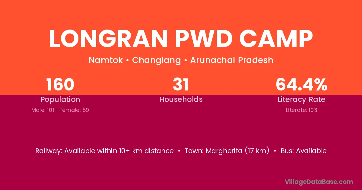 Longran Pwd Camp village has a total population of 160 people, of which 101 are males and 59 are females.