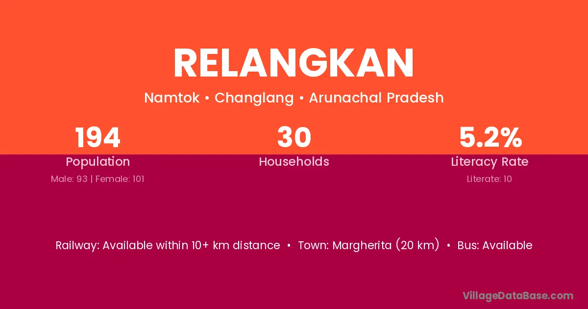 Margherita (20 km) is the nearest town to Relangkan village for major economic activities and is located approximately 20 km away.