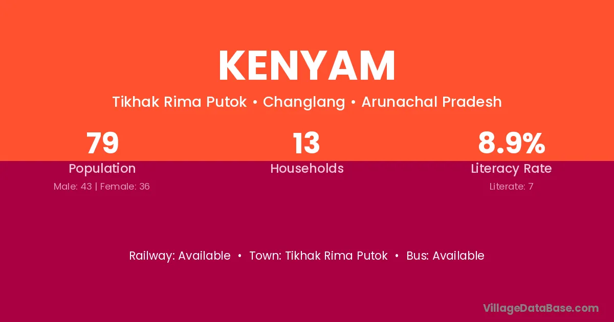 Kenyam village has a total population of 79 people, of which 43 are males and 36 are females.