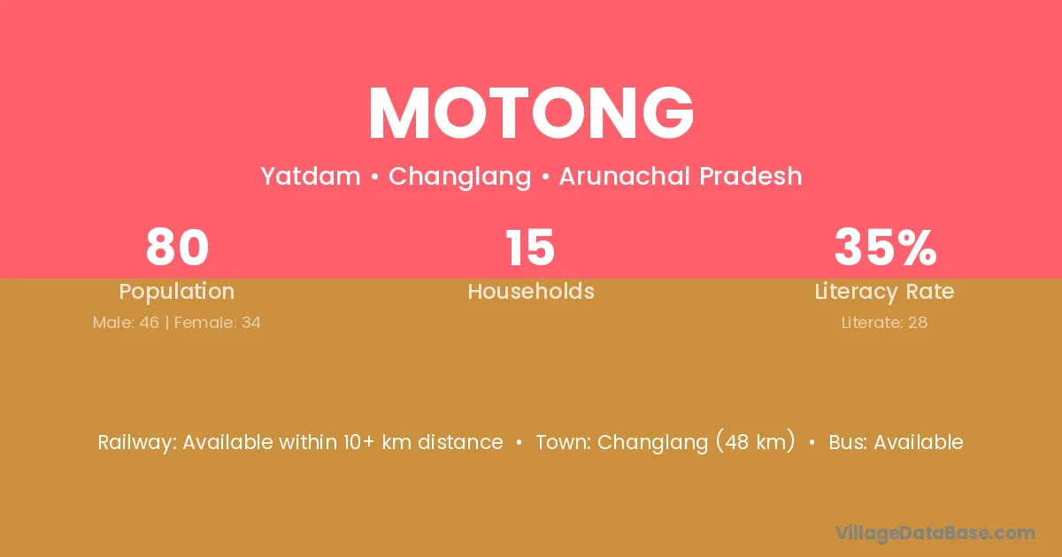 Changlang (48 km) is the nearest town to Motong village for major economic activities and is located approximately 48 km away.