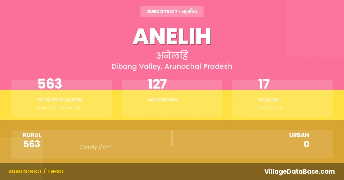 According to the 2011 census The total area of Anelih Circle is 657 km², with a population of 563 people. The population density is 1 inhabitants per square kilometre, and there are approximately 127 houses in the sub district.