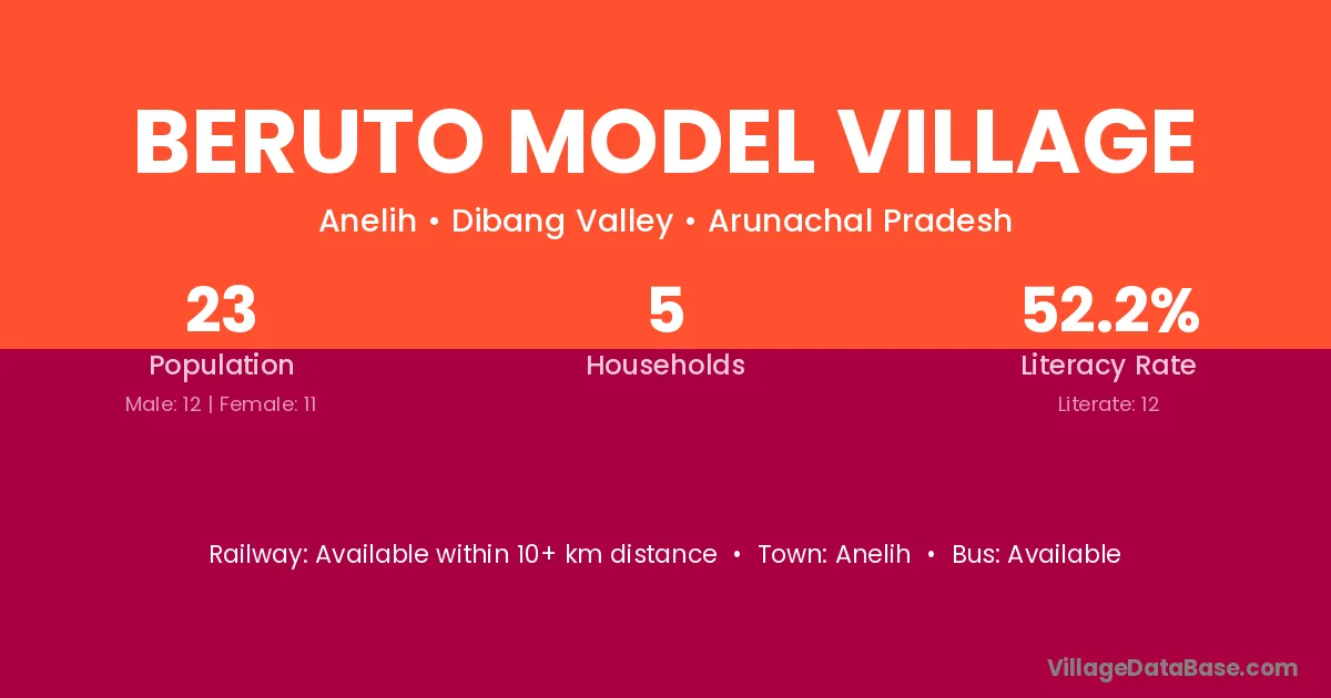 Beruto Model Village village has a total population of 23 people, of which 12 are males and 11 are females.