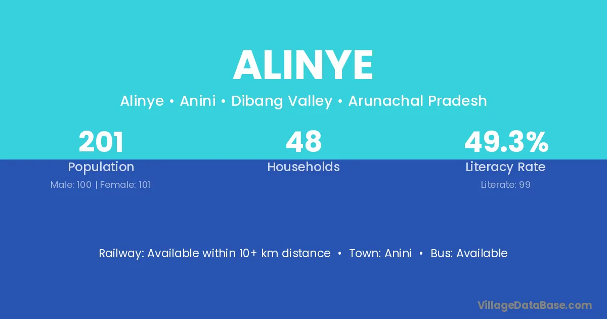 Alinye village has a total population of 201 people, of which 100 are males and 101 are females.