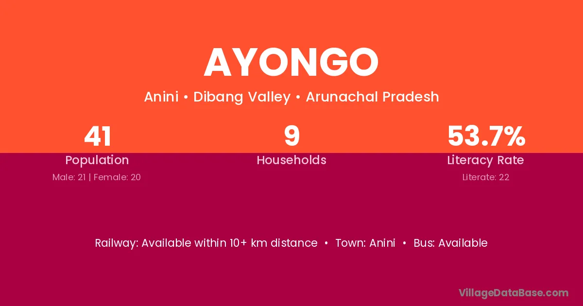 Ayongo village has a total population of 41 people, of which 21 are males and 20 are females.