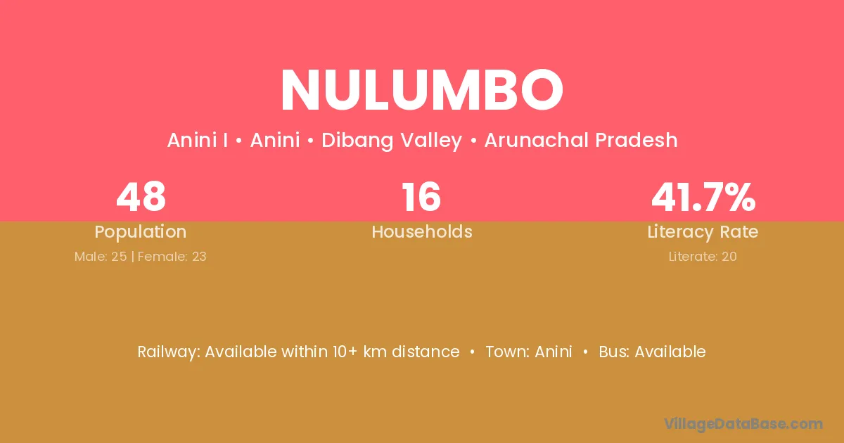 The literacy rate of Nulumbo village is 41.67%. Male literacy stands at 40.00% and female literacy at 43.48%.
