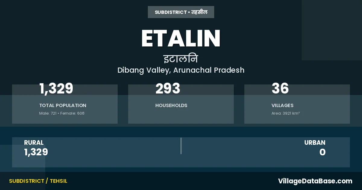 Etalin is a town and Circle in the Dibang Valley district of the Arunachal Pradesh. In India, a Circle is a subdivision of a district responsible for the administration and revenue collection of a specific area within the district. Circles play a crucial role in the local governance structure, contributing significantly to the development and administration of their communities.
