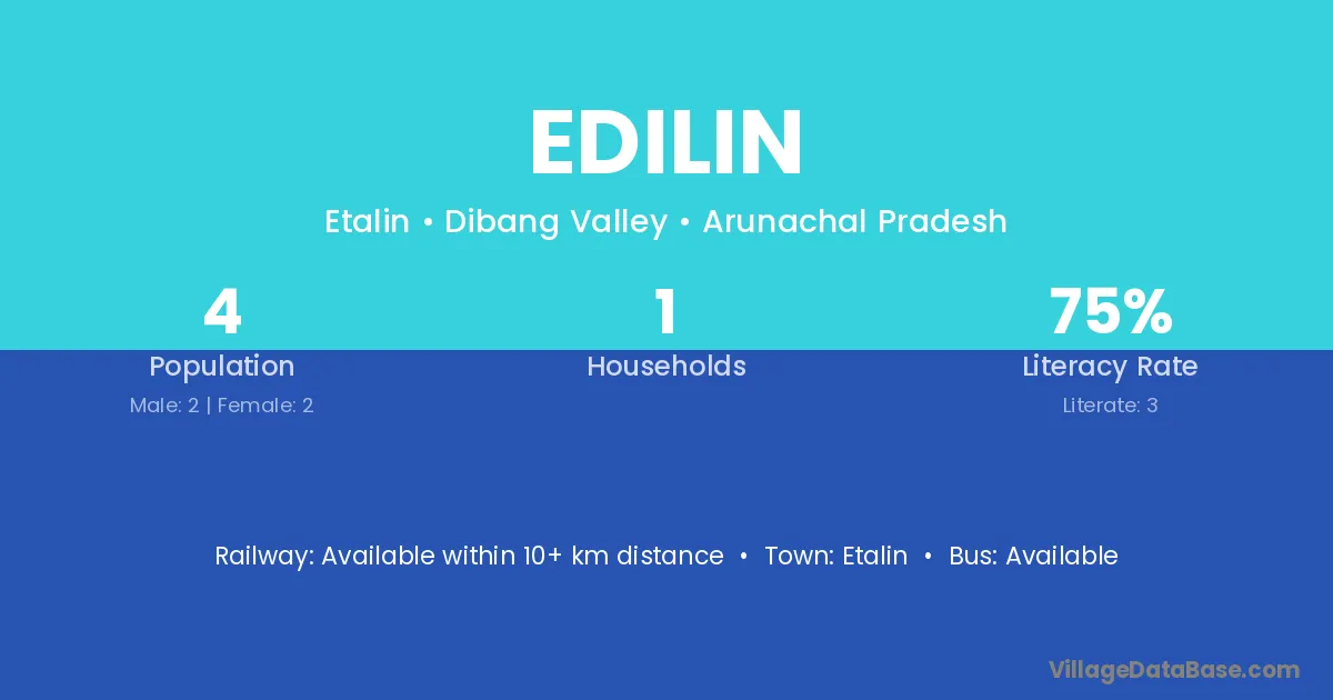 The literacy rate of Edilin village is 75.00%. Male literacy stands at 50.00% and female literacy at 100.00%.