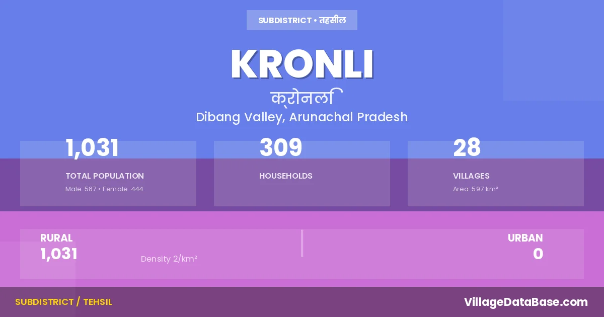 Kronli is a town and Circle in the Dibang Valley district of the Arunachal Pradesh. In India, a Circle is a subdivision of a district responsible for the administration and revenue collection of a specific area within the district. Circles play a crucial role in the local governance structure, contributing significantly to the development and administration of their communities.