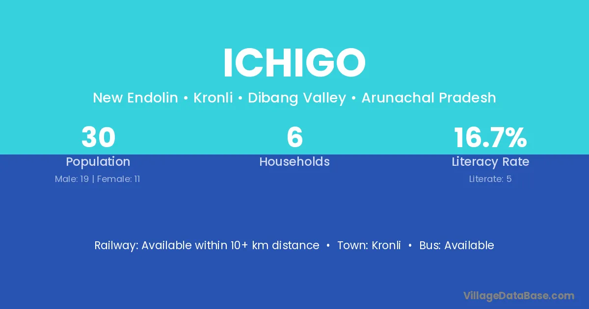 The literacy rate of Ichigo village is 16.67%. Male literacy stands at 26.32% and female literacy at 0.00%.