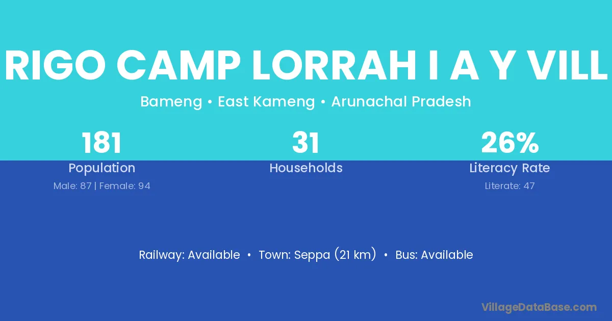 Seppa (21 km) is the nearest town to Rigo Camp Lorrah I A Y Vill village for major economic activities and is located approximately 21 km away.