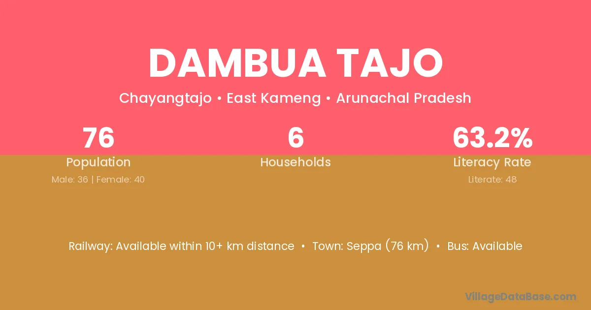 Seppa (76 km) is the nearest town to Dambua Tajo village for major economic activities and is located approximately 76 km away.