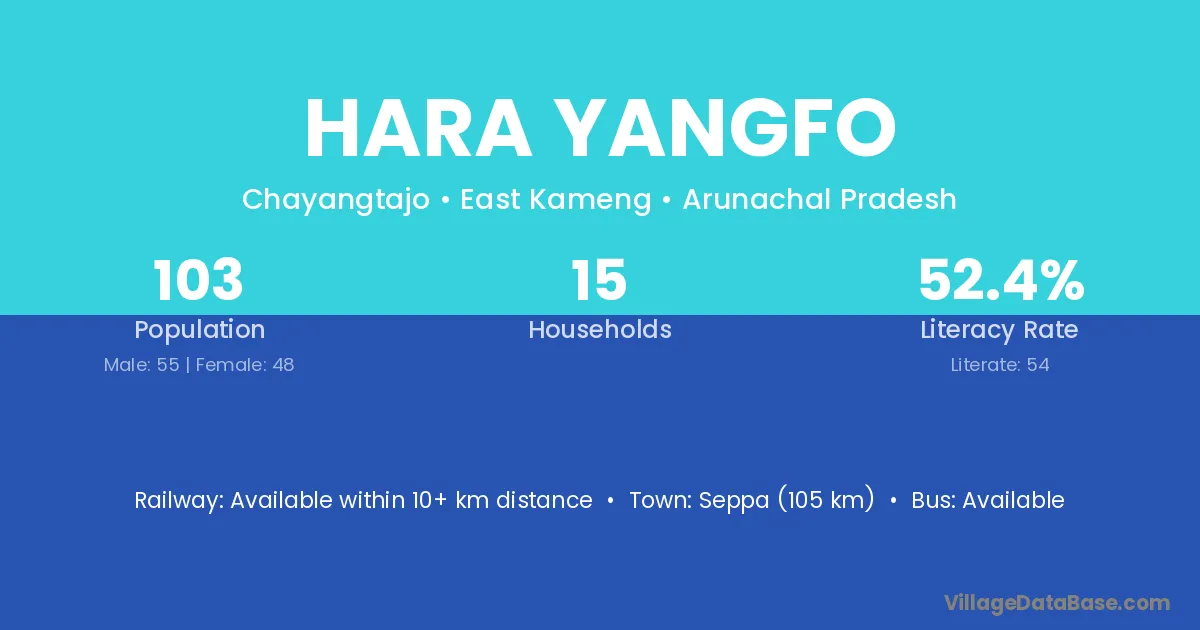 Seppa (105 km) is the nearest town to Hara Yangfo village for major economic activities and is located approximately 105 km away.