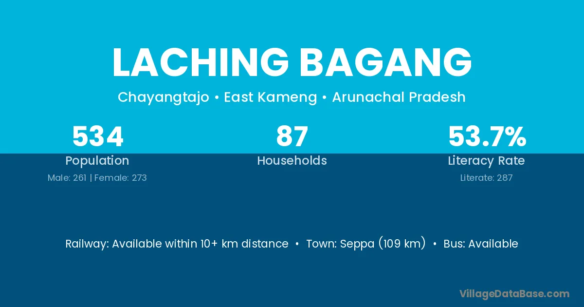 Seppa (109 km) is the nearest town to Laching Bagang village for major economic activities and is located approximately 109 km away.