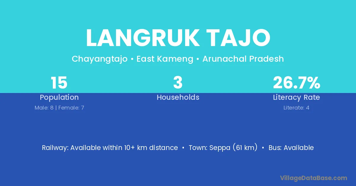 Seppa (61 km) is the nearest town to Langruk Tajo village for major economic activities and is located approximately 61 km away.
