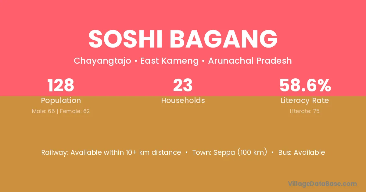 Soshi Bagang village has a total population of 128 people, of which 66 are males and 62 are females.