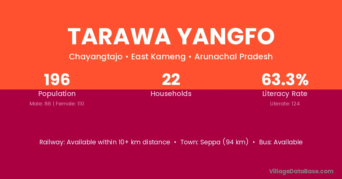 Seppa (94 km) is the nearest town to Tarawa Yangfo village for major economic activities and is located approximately 94 km away.