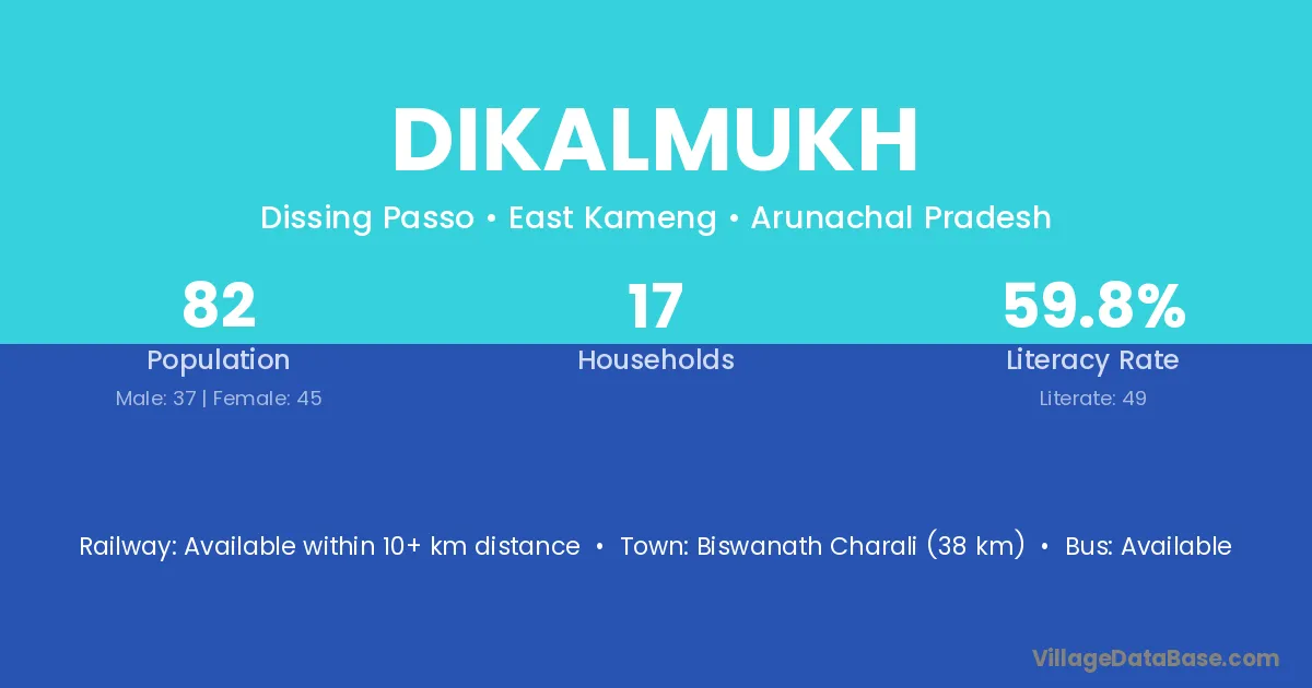 Dikalmukh village has a total population of 82 people, of which 37 are males and 45 are females.