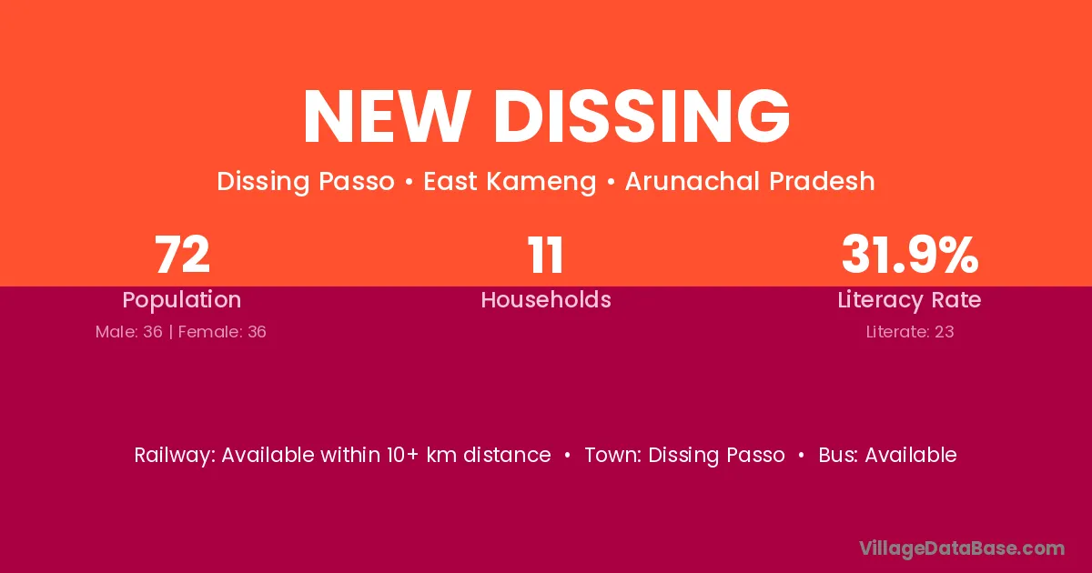 The literacy rate of New Dissing village is 31.94%. Male literacy stands at 36.11% and female literacy at 27.78%.