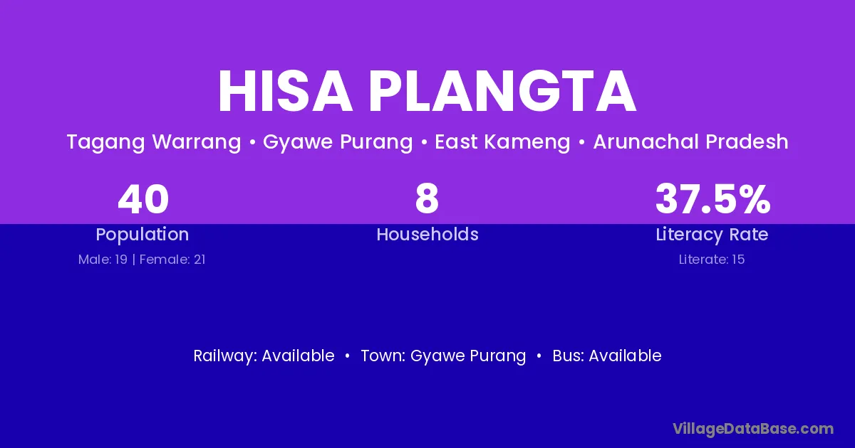 The literacy rate of Hisa Plangta village is 37.50%. Male literacy stands at 42.11% and female literacy at 33.33%.