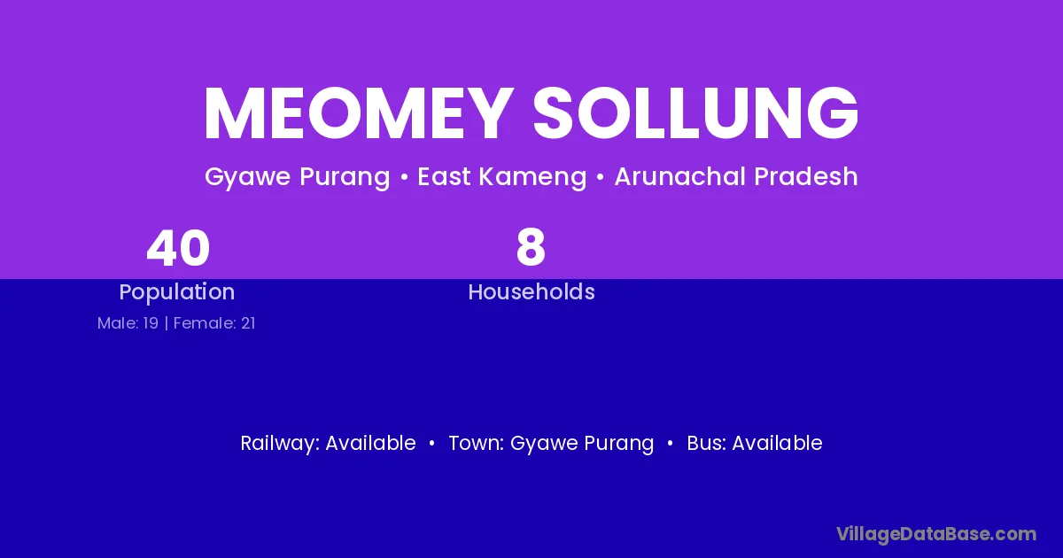 Meomey Sollung village has a total population of 40 people, of which 19 are males and 21 are females.