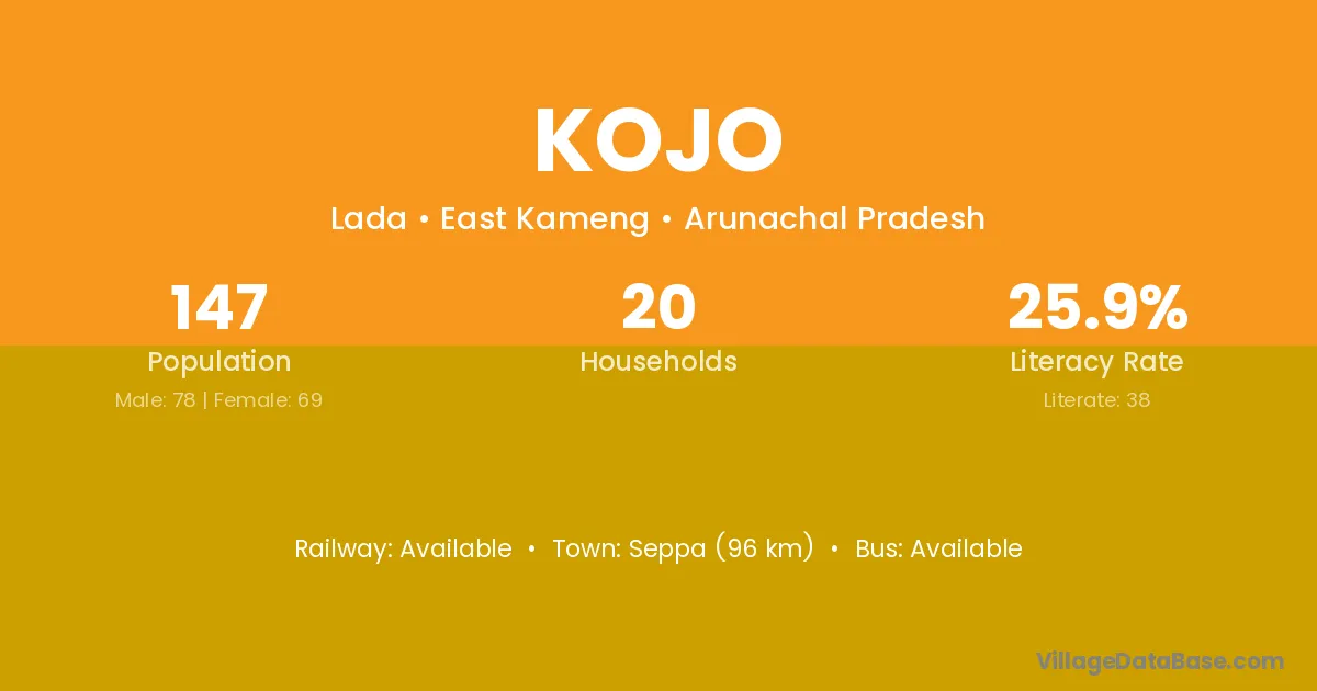 Seppa (96 km) is the nearest town to Kojo village for major economic activities and is located approximately 96 km away.