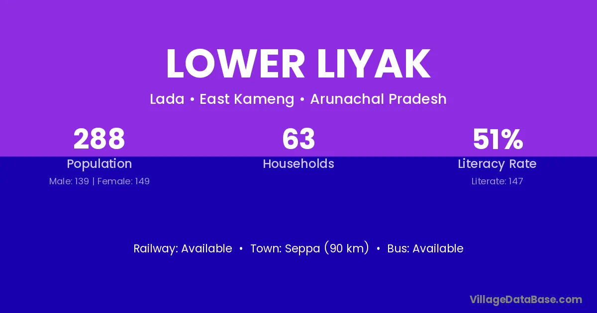The literacy rate of Lower Liyak village is 51.04%. Male literacy stands at 61.15% and female literacy at 41.61%.