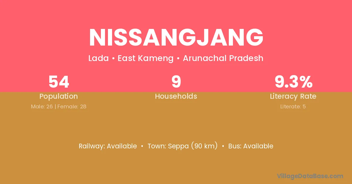Seppa (90 km) is the nearest town to Nissangjang village for major economic activities and is located approximately 90 km away.
