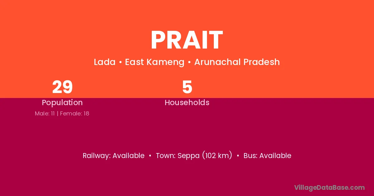 Seppa (102 km) is the nearest town to Prait village for major economic activities and is located approximately 102 km away.