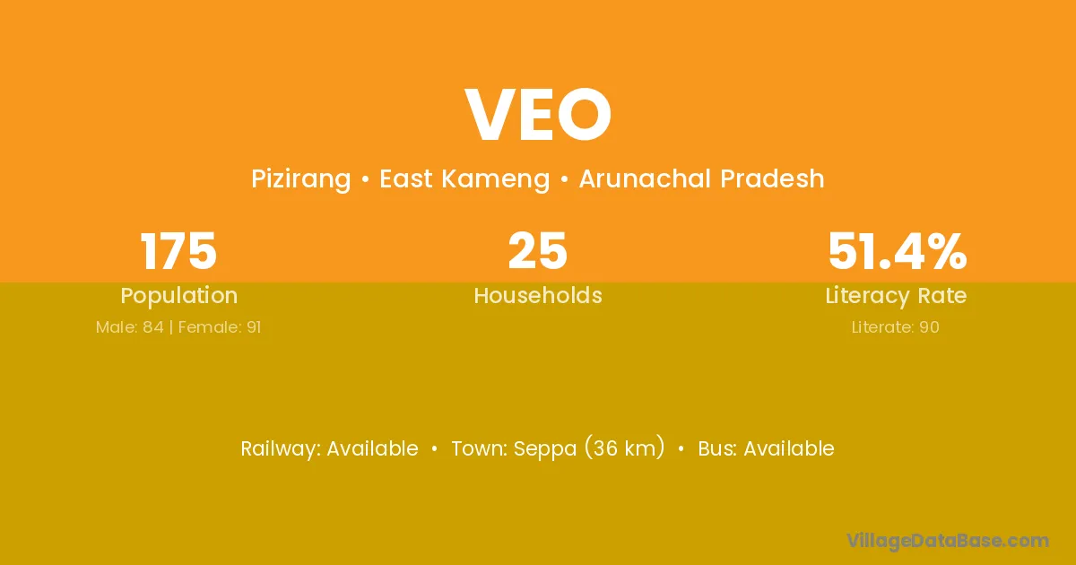 Seppa (36 km) is the nearest town to Veo village for major economic activities and is located approximately 36 km away.