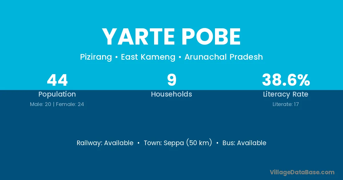 The literacy rate of Yarte Pobe village is 38.64%. Male literacy stands at 40.00% and female literacy at 37.50%.