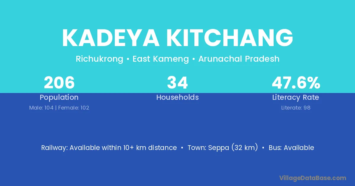 Kadeya Kitchang village has a total population of 206 people, of which 104 are males and 102 are females.