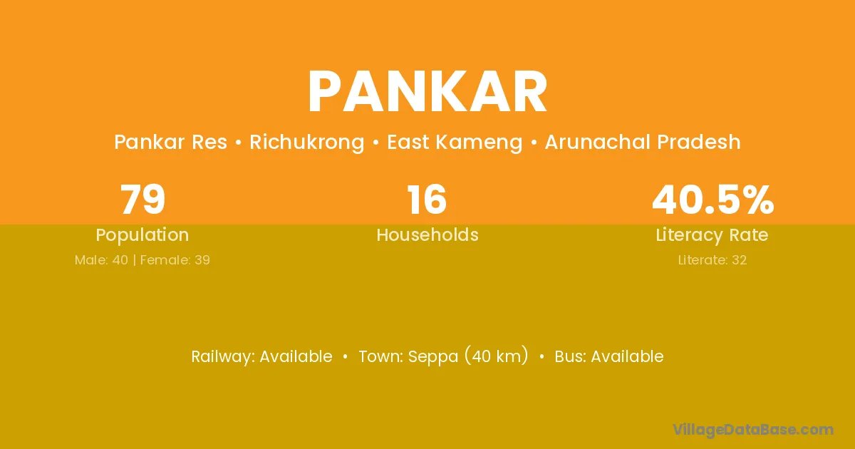 Seppa (40 km) is the nearest town to Pankar village for major economic activities and is located approximately 40 km away.