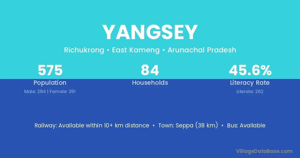 Seppa (38 km) is the nearest town to Yangsey village for major economic activities and is located approximately 38 km away.