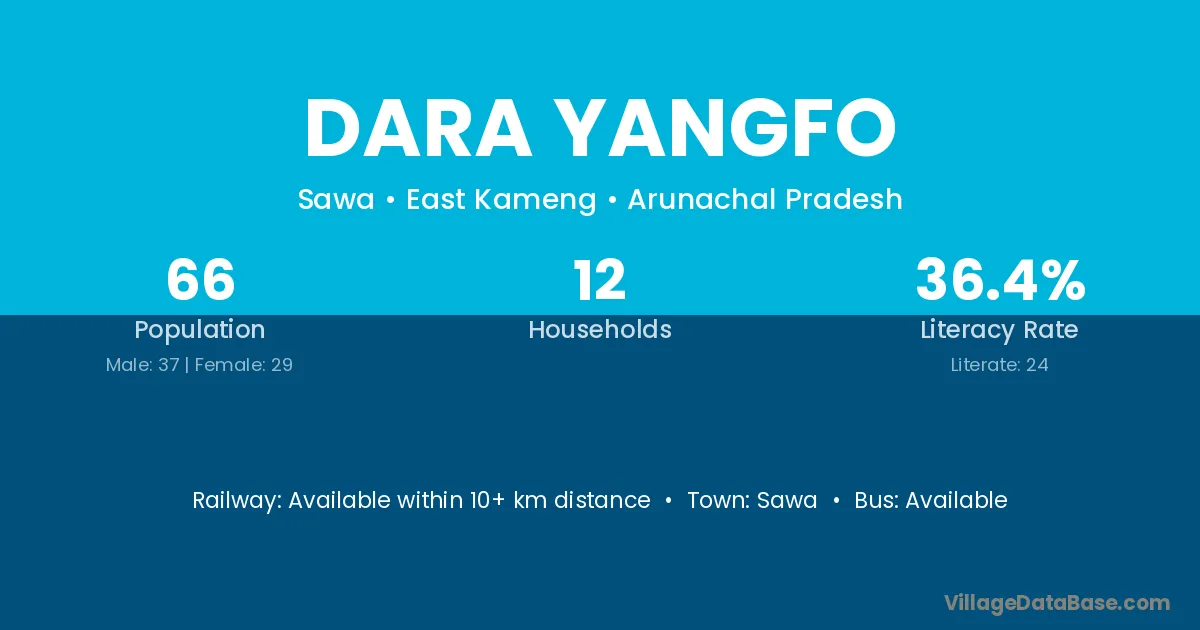 The literacy rate of Dara Yangfo village is 36.36%. Male literacy stands at 37.84% and female literacy at 34.48%.