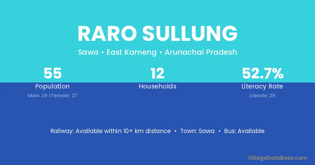 Raro Sullung village has a total population of 55 people, of which 28 are males and 27 are females.