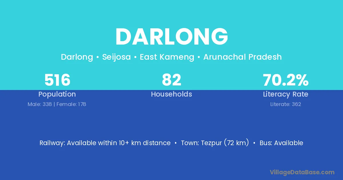 Tezpur (72 km) is the nearest town to Darlong village for major economic activities and is located approximately 72 km away.