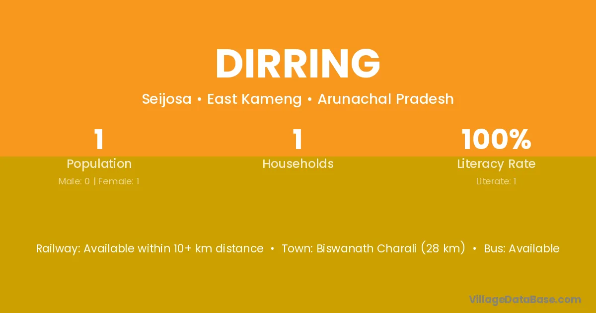 Biswanath Charali (28 km) is the nearest town to Dirring village for major economic activities and is located approximately 28 km away.