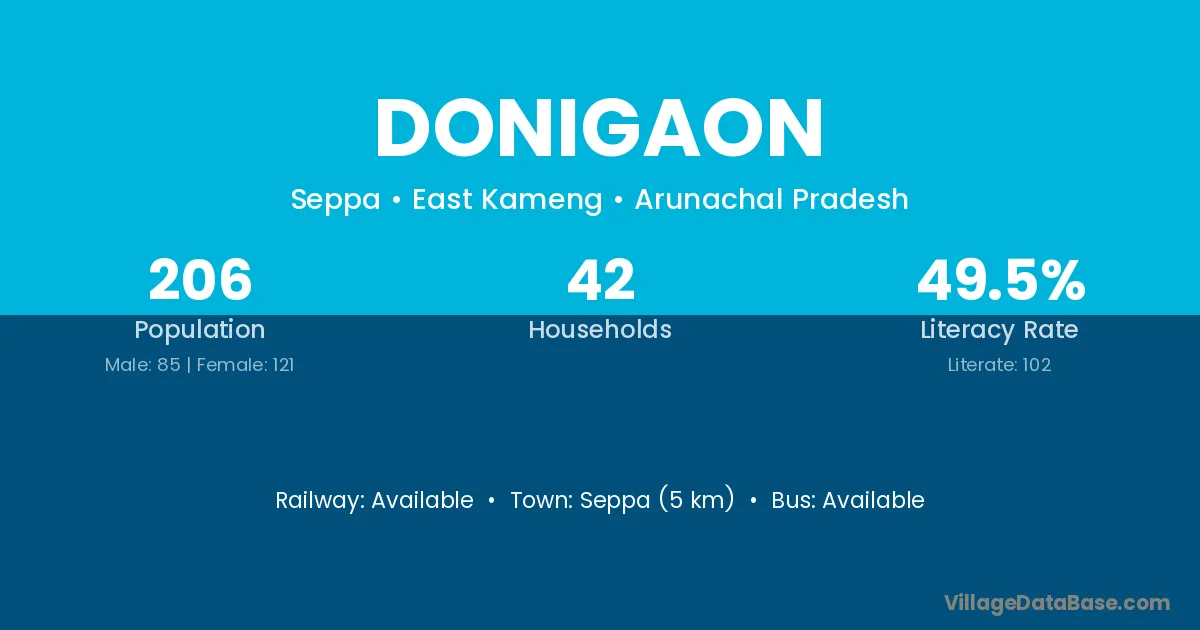 Seppa (5 km) is the nearest town to Donigaon village for major economic activities and is located approximately 5 km away.