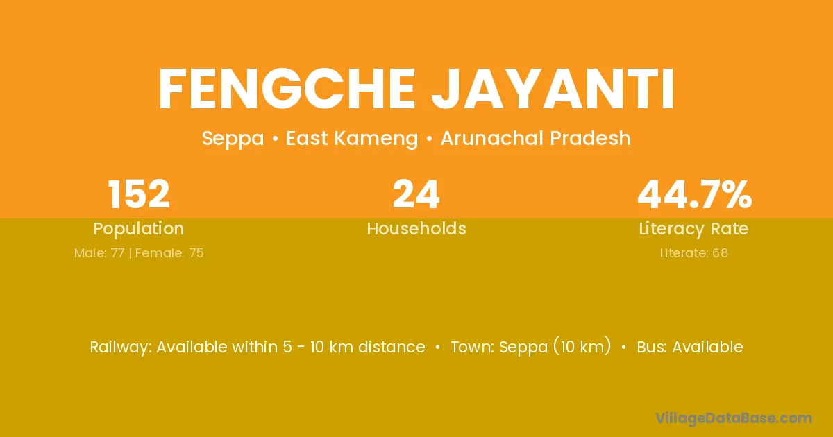 Seppa (10 km) is the nearest town to Fengche Jayanti village for major economic activities and is located approximately 10 km away.