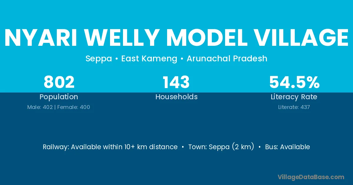Seppa (2 km) is the nearest town to Nyari Welly Model Village village for major economic activities and is located approximately 2 km away.