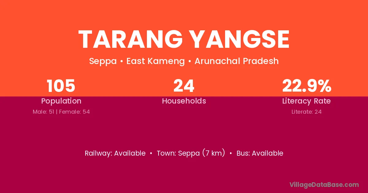 Tarang Yangse village has a total population of 105 people, of which 51 are males and 54 are females.