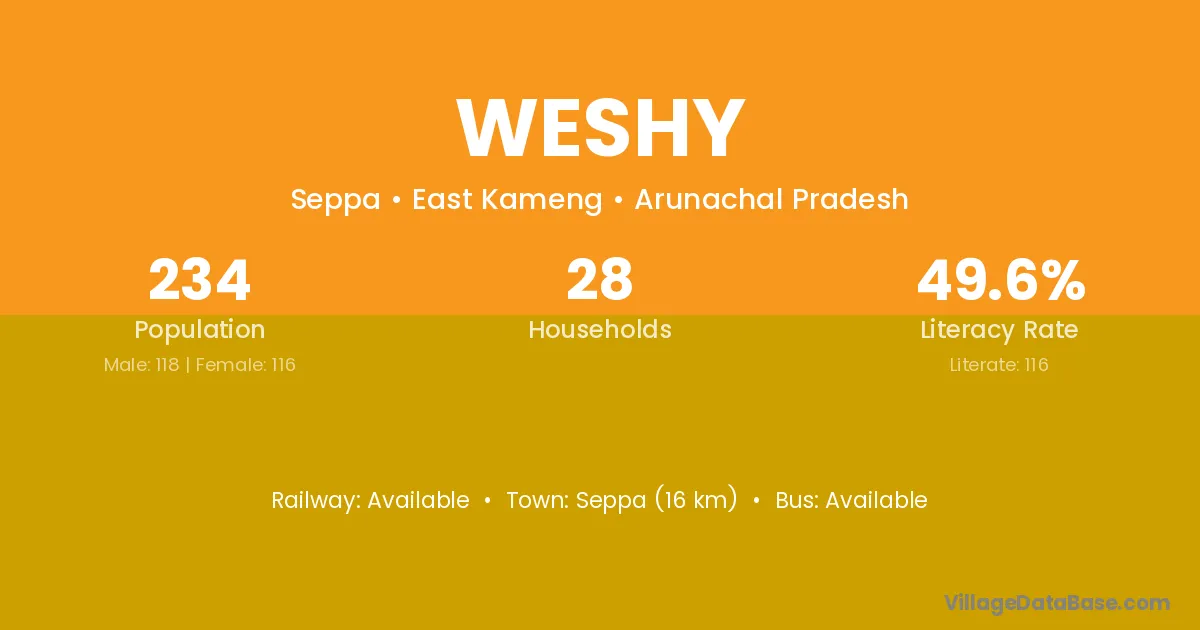 Seppa (16 km) is the nearest town to Weshy village for major economic activities and is located approximately 16 km away.