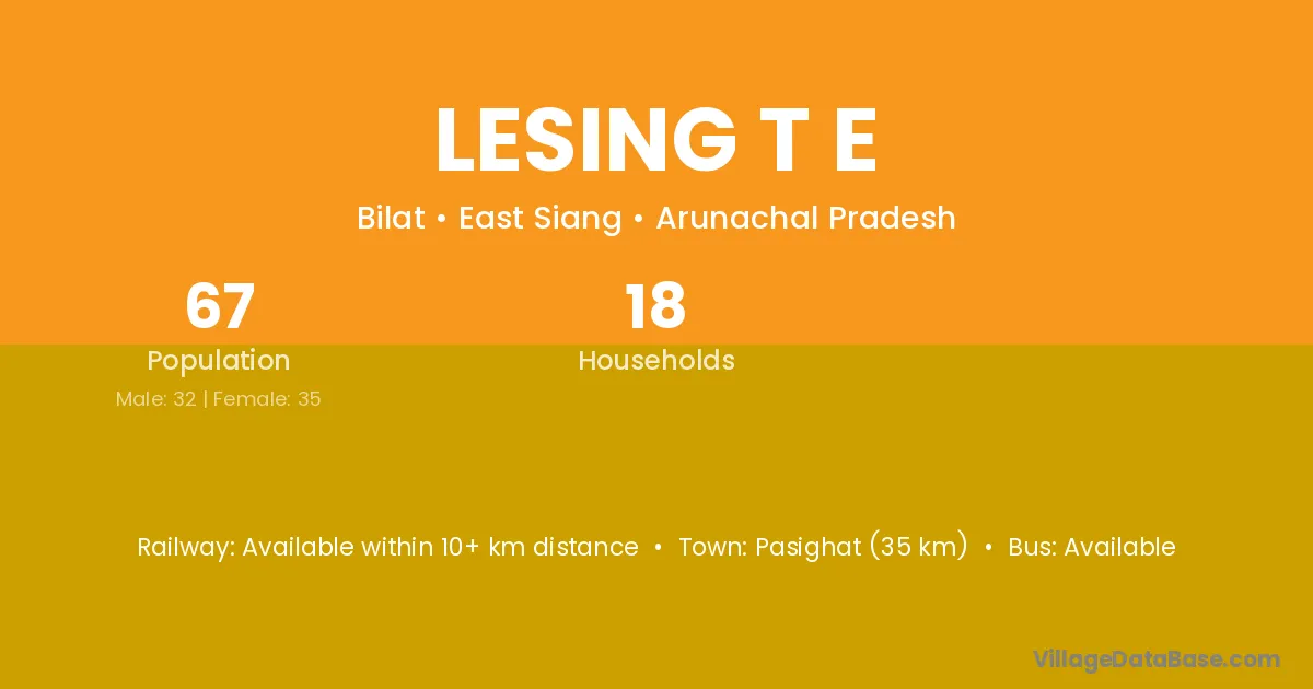 Pasighat (35 km) is the nearest town to Lesing T E village for major economic activities and is located approximately 35 km away.