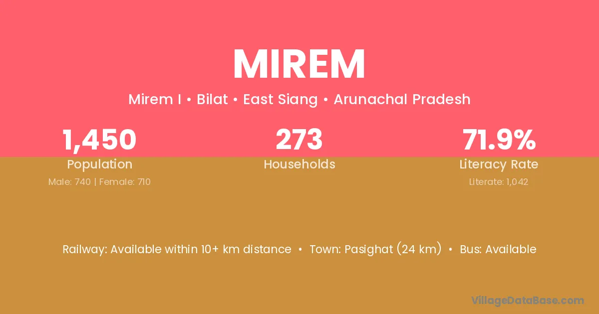 Pasighat (24 km) is the nearest town to Mirem village for major economic activities and is located approximately 24 km away.