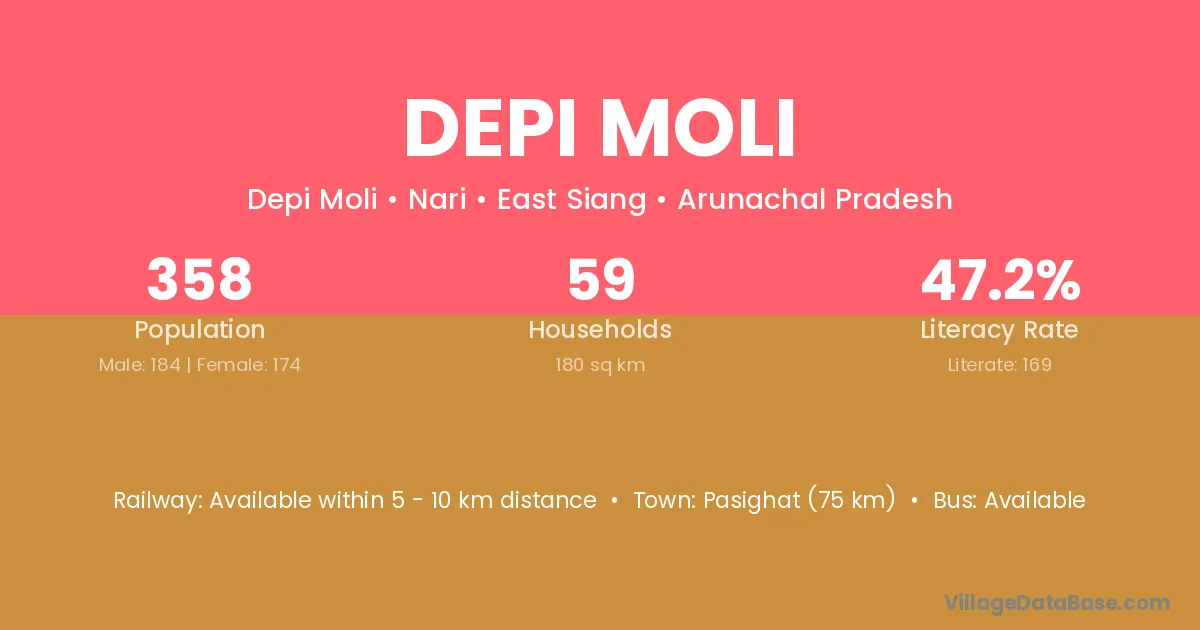 The literacy rate of Depi Moli village is 47.21%. Male literacy stands at 54.35% and female literacy at 39.66%.